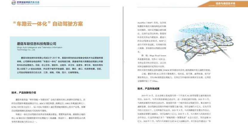 近日,蘑菇车联“车路云一体化”系统级方案入选2022世界智能网联汽车大会创新技术与产品,公司“车路云一体化”核心软硬件自研能力获多方高度认可。